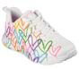 Internationally renowned muralist James Goldcrown brings his iconic #Lovewall heart designs to Skechers in this inspiring collaboration. Show your creative style with the Skechers x JGoldcrown: Skechers Street UNO Lite - Heart of Hearts. This lace-up fashion sneaker features a print of the artist's signature heart design that extends to the outsole, synthetic durabuck and perforated trimmed upper with a Skechers Air-Cooled Memory Foam® insole, plus a platform wedge midsole.